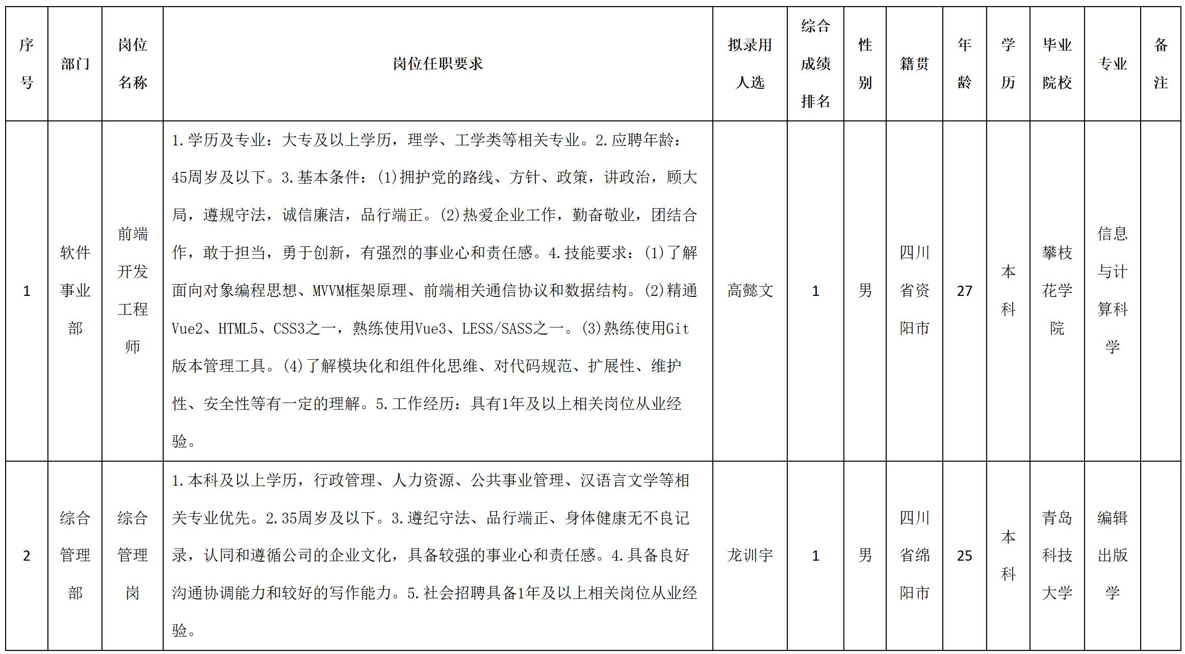 根據(jù)四川九強(qiáng)通信科技有限公司發(fā)布的招聘公告及招聘相關(guān)規(guī)定,經(jīng)測試、考察、體檢等程序,擬錄用高懿文等2名同志到四川九強(qiáng)通信科技有限公司工作,現(xiàn)予以公示,具體情況如下: