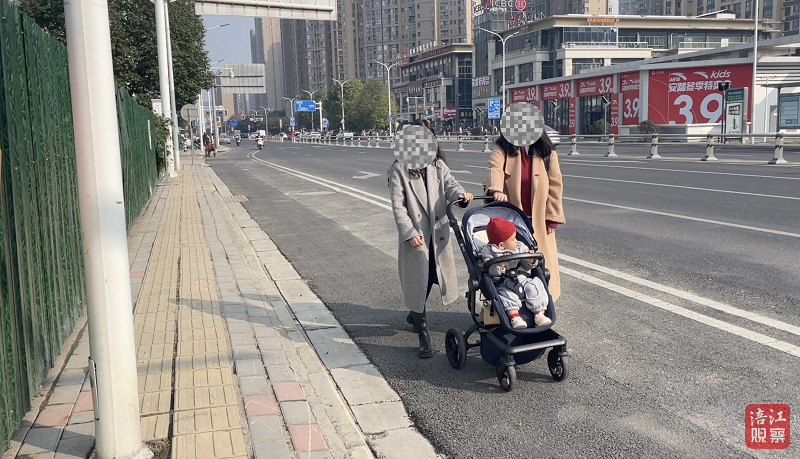 行人推著嬰兒車在非機動車道上行走