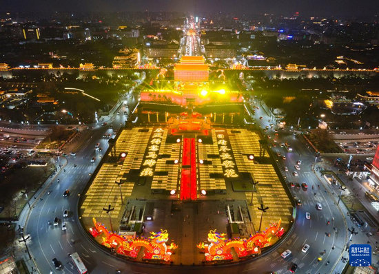 1月4日拍攝的西安城墻南門“長安燈會”景色(無人機照片)。