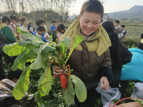 綠意盎然的田壟間,紅蘿卜探出鮮艷的頭部,白蘿卜圓潤的身子半掩于土中,翠綠纓葉隨風輕搖。學(xué)生們在老師的帶領(lǐng)下,一邊哼唱《拔蘿卜》,一邊熱火朝天地忙碌。隨著一顆顆飽滿的蘿卜破土而出,孩子們細心擰去莖葉,將成果整齊裝入袋中。不多時,就采收蘿卜1000多公斤。這些蘿卜將由學(xué)生帶回家中,與家人共享勞動收獲的喜悅。
