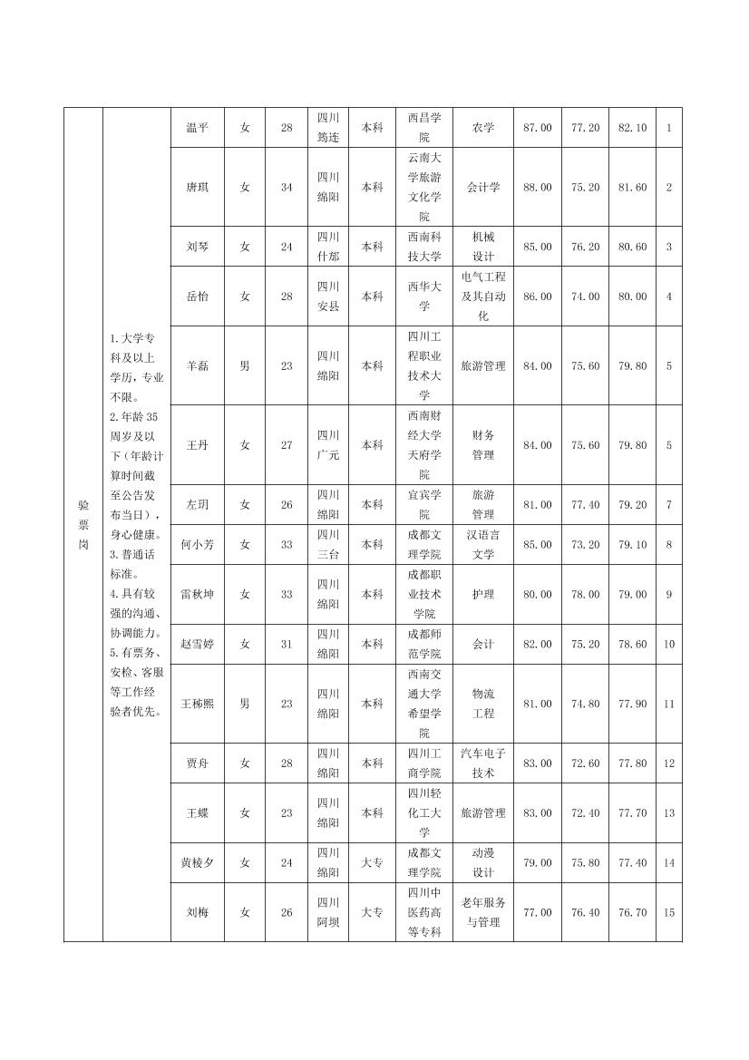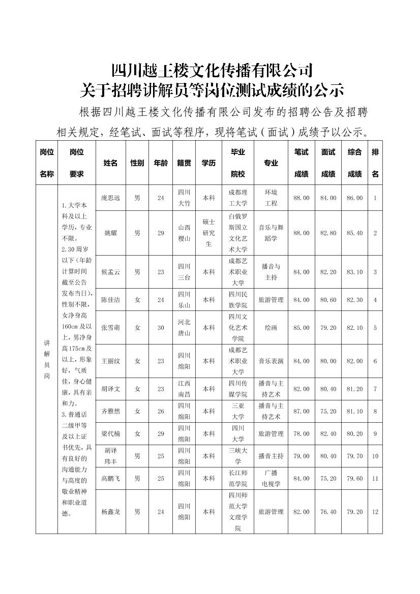 四川越王樓文化傳播有限公司關(guān)于招聘講解員等崗位測試成績的公示