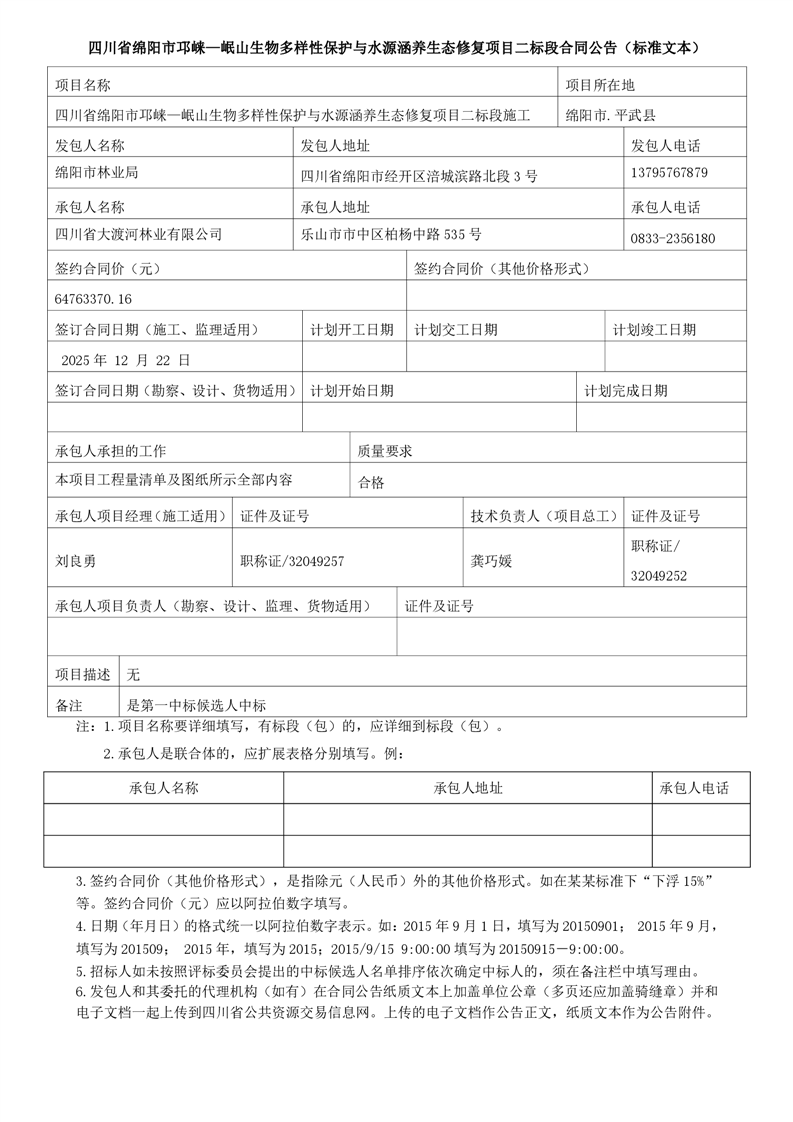 四川省綿陽市邛崍—岷山生物多樣性保護(hù)與水源涵養(yǎng)生態(tài)修復(fù)項(xiàng)目一標(biāo)段、二標(biāo)段合同公告