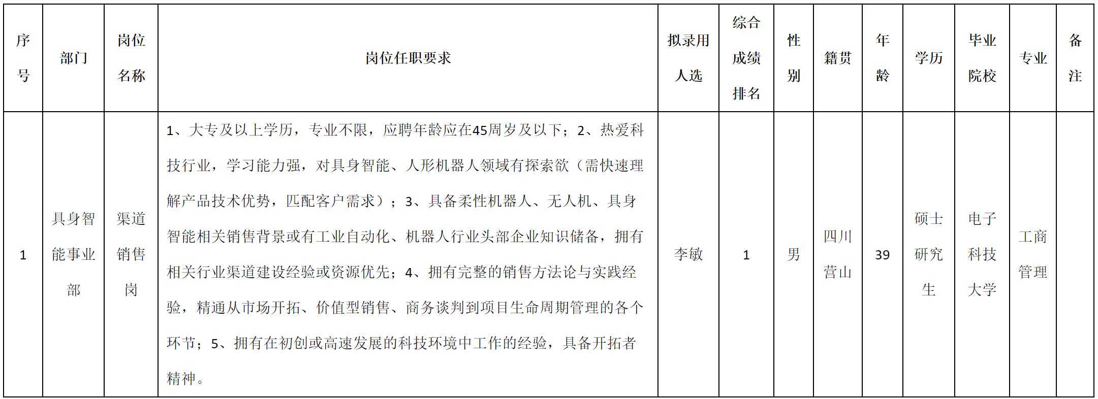 根據(jù)四川九洲投資控股集團有限公司軟件與數(shù)據(jù)智能軍團發(fā)布的招聘公告及招聘相關(guān)規(guī)定,經(jīng)測試、考察、體檢等程序,擬錄用李敏同志到四川九洲投資控股集團有限公司軟件與數(shù)據(jù)智能軍團工作,現(xiàn)予以公示,具體情況如下: