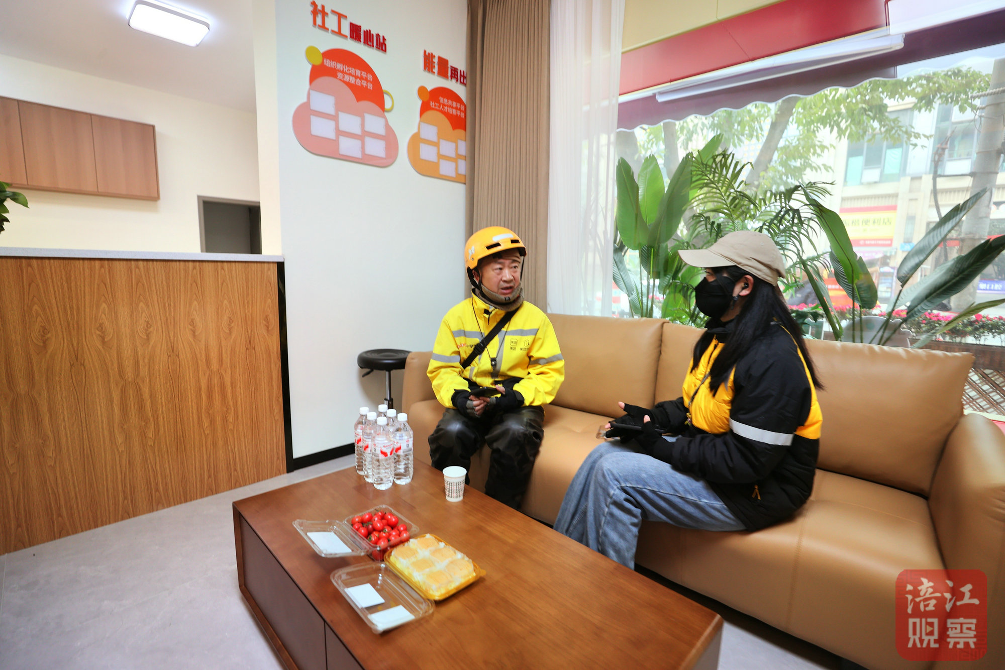 這個大約120平方米的空間,已成為劉曉峰和同事們在街頭的“家”。驛站配備了飲水機、充電裝置、微波爐、急救藥箱等設(shè)施,為新就業(yè)形態(tài)勞動者提供暖心的“能量補給”。