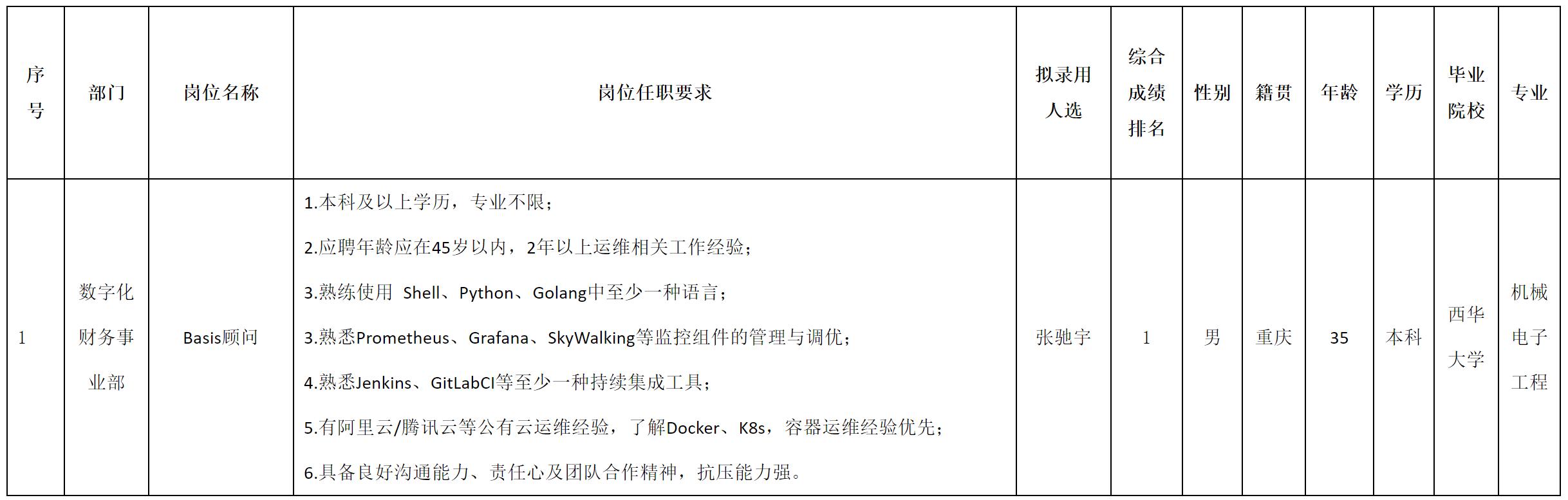 根據(jù)四川虹信軟件股份有限公司發(fā)布的招聘公告及招聘相關(guān)規(guī)定,經(jīng)測(cè)試、考察、體檢等程序,擬錄用張馳宇同志到四川虹信軟件股份有限公司工作,現(xiàn)予以公示,具體情況如下: