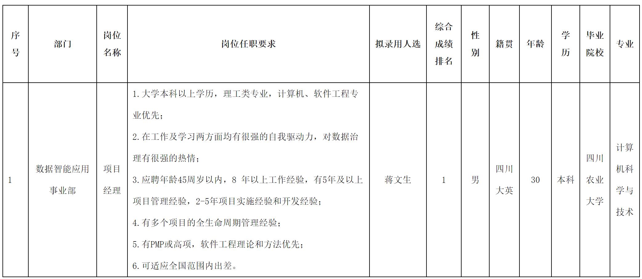 根據(jù)四川虹信軟件股份有限公司發(fā)布的招聘公告及招聘相關(guān)規(guī)定,經(jīng)測試、考察、體檢等程序,擬錄用蔣文生同志到四川虹信軟件股份有限公司工作,現(xiàn)予以公示,具體情況如下: