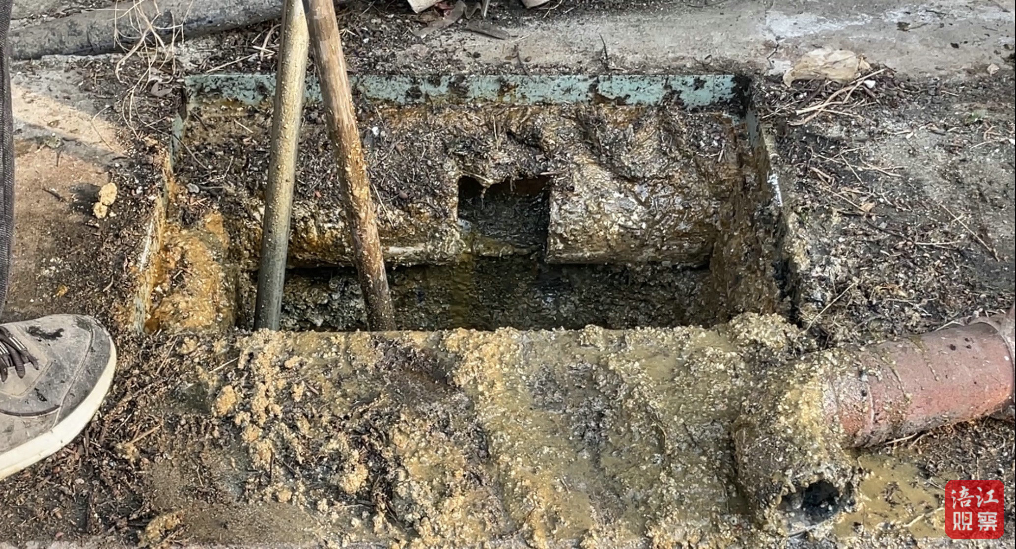 次日一早,疏通工程隊進場。隨著蓋板被掀開,堵塞物真相大白——竟是一塊塊凝固的油泥、油塊,最大寬度達25厘米。