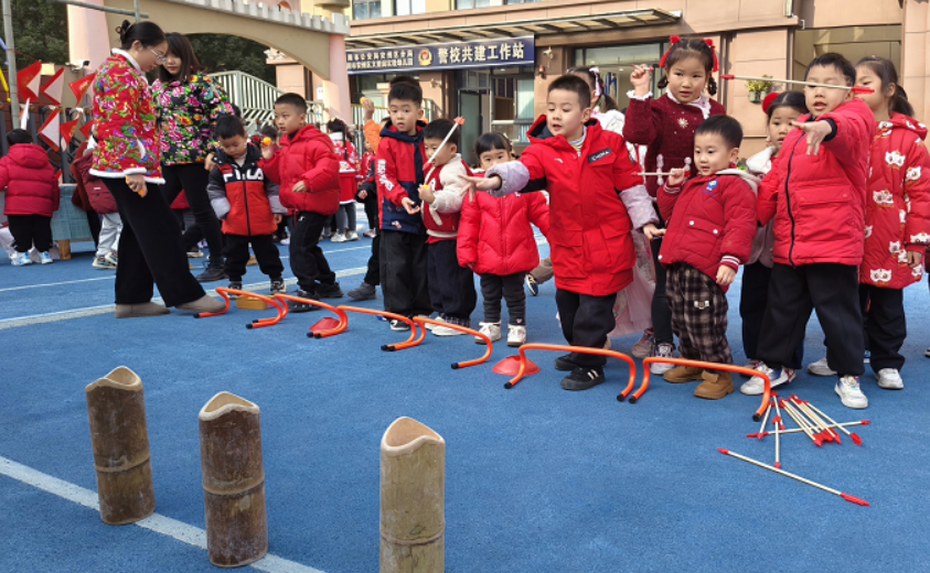 游園環(huán)節(jié)將活動推向高潮。星園變身為“新春樂園”,設置了十項融合馬年文化與運動趣味的關卡:“馬‘拓’飛燕”讓幼兒拓印福字,感受傳統(tǒng)藝術;“策馬奔騰”需用扇子驅(qū)動氣球馬前進,鍛煉協(xié)調(diào)能力;“趣味套馬”“一馬當先”等游戲則激發(fā)幼兒的競賽意識與合作精神。孩子們身著紅色節(jié)日服裝,在闖關中積累“星幣”,體驗成功喜悅。