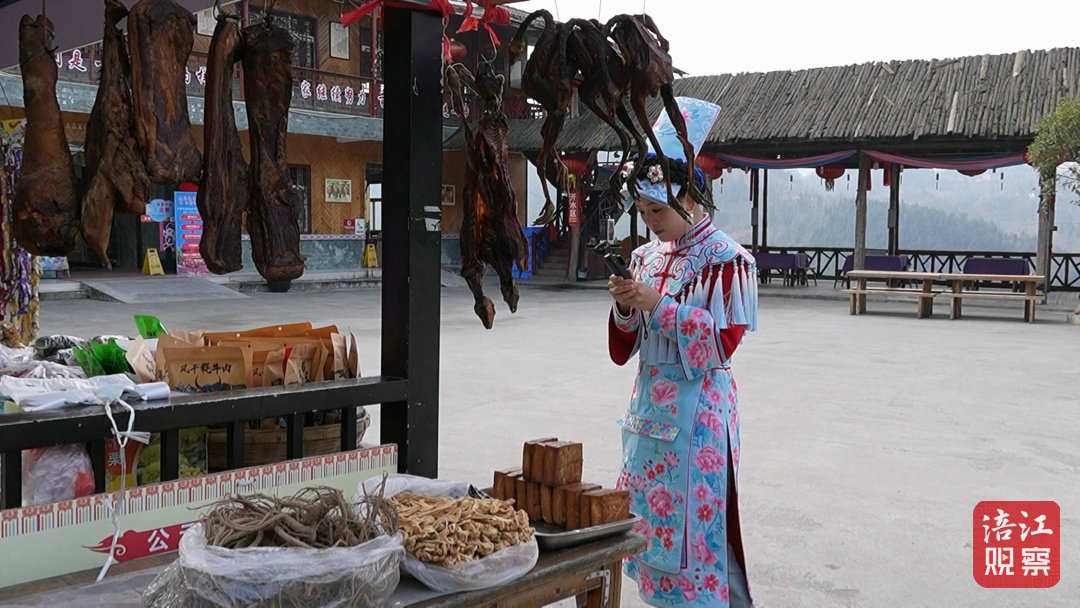 00后羌族姑娘陳新一站在鏡子前換上艷麗的羌服,隨后提著攝像設備走進村里一戶羌家的臘肉炕房。灶臺上,懸掛著一排排色澤紅潤的臘肉,陽光透過窗欞灑在臘肉上,透出誘人的光澤。她舉起相機,一邊調整角度,一邊與正在熏肉的婆婆聊天。