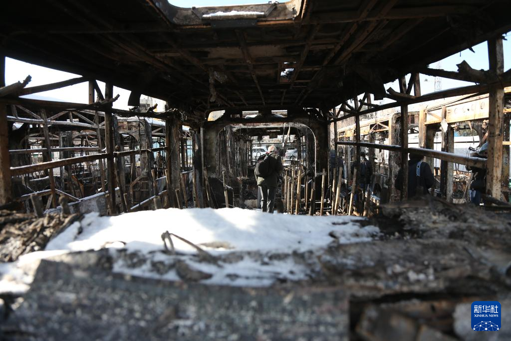 1月21日,在伊朗首都德黑蘭,一名男子站在一輛于近期騷亂中被燒毀的公交車內(nèi)。新華社記者 沙達提 攝