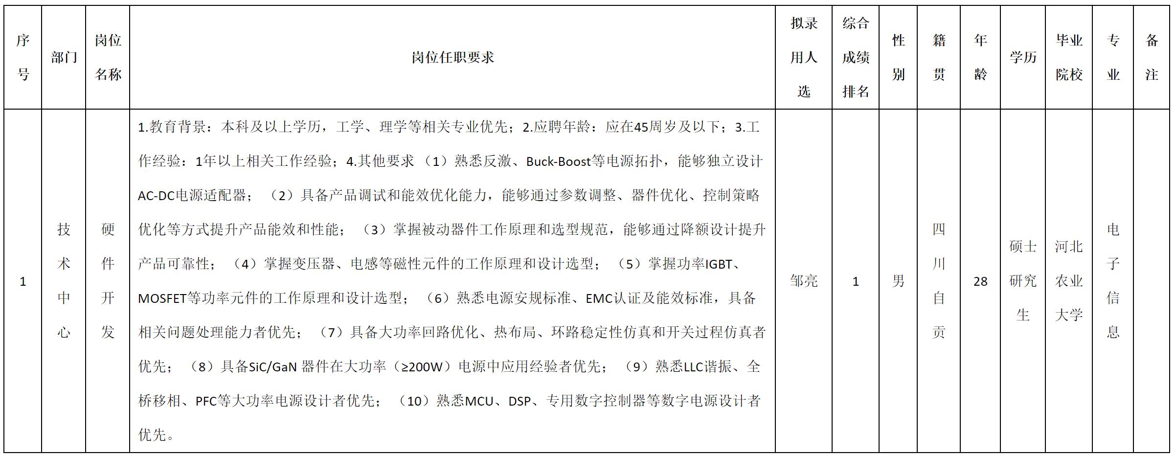 根據(jù)四川九州電子科技股份有限公司發(fā)布的招聘公告及招聘相關(guān)規(guī)定,經(jīng)測試、考察、體檢等程序,擬錄用鄒亮同志到四川九州電子科技股份有限公司工作,現(xiàn)予以公示,具體情況如下: