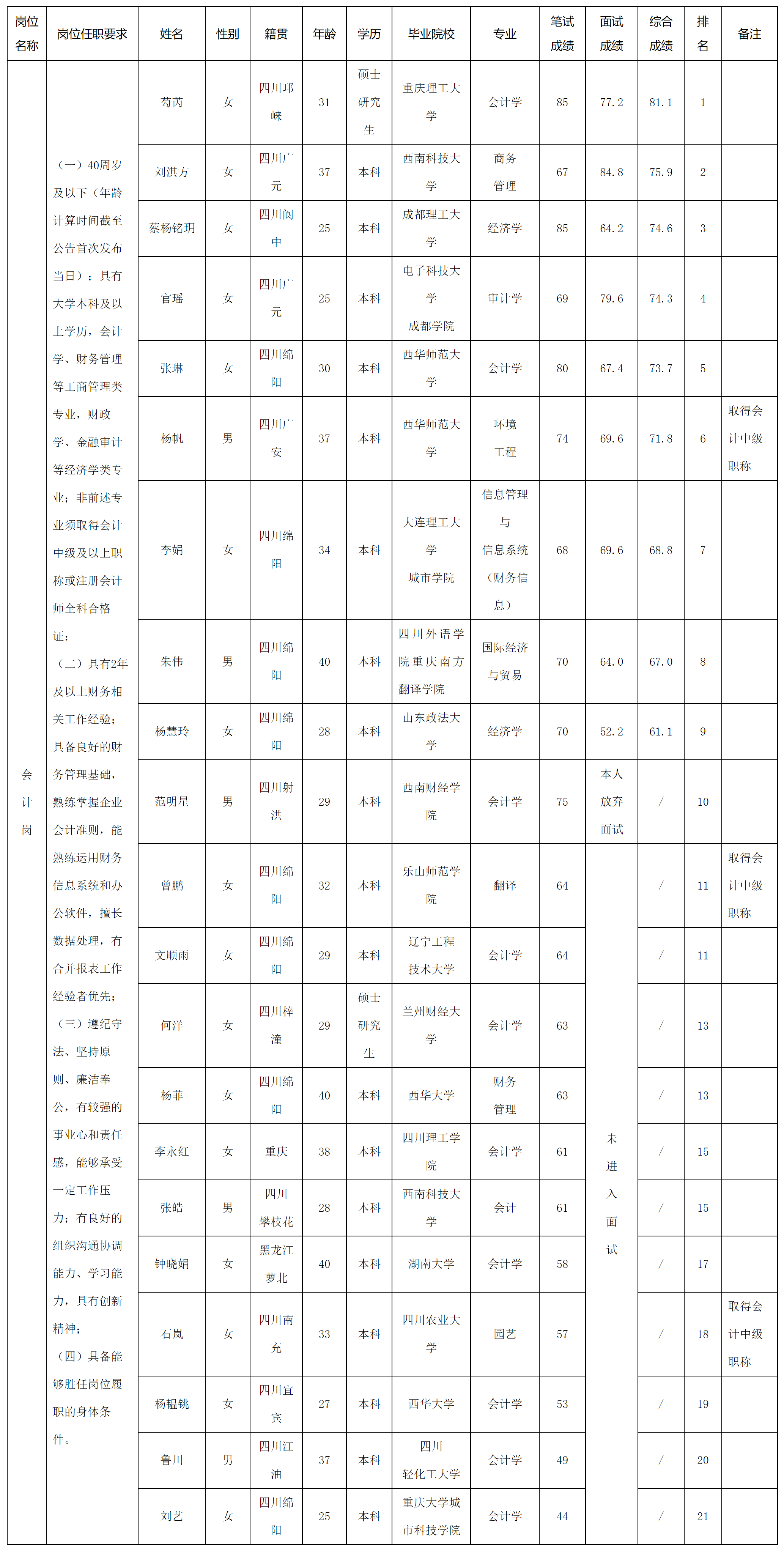 根據(jù)綿陽金控投資管理有限責(zé)任公司發(fā)布的招聘公告及招聘相關(guān)規(guī)定,經(jīng)筆試、面試等程序,現(xiàn)將筆試(面試)成績予以公示。