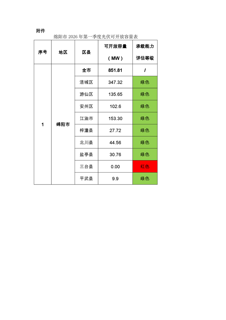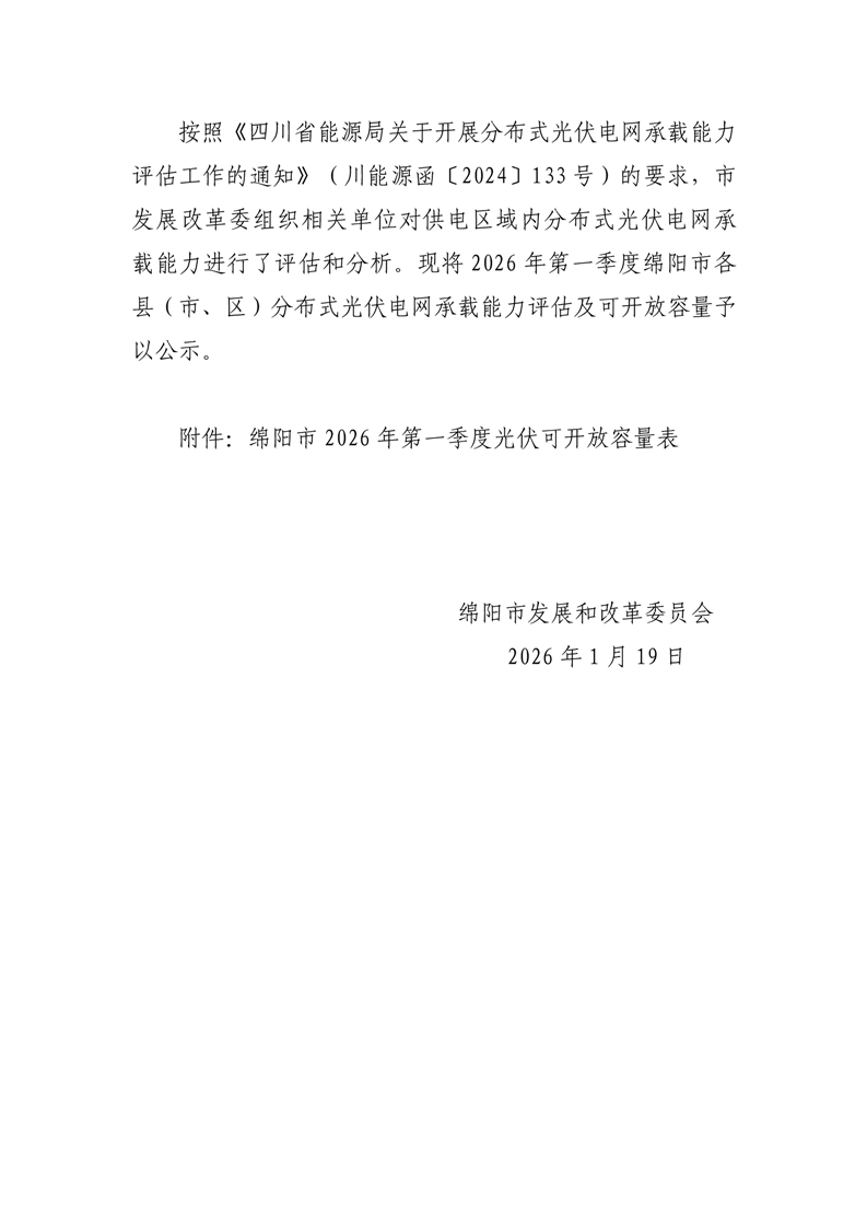 綿陽市發(fā)展和改革委員會關(guān)于對2026年第一季度分布式光伏電網(wǎng)承載能力評估及可開放容量的公示