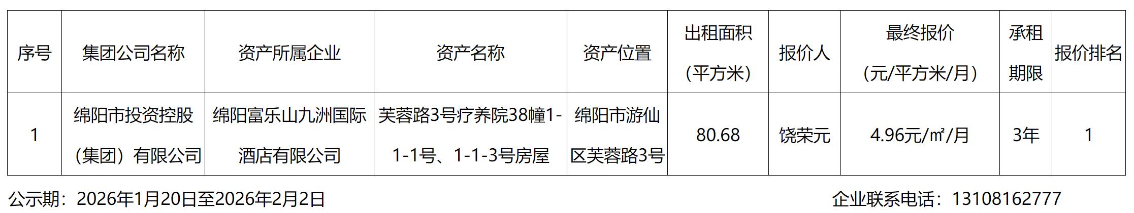 綿陽富樂山九洲國際酒店有限公司資產(chǎn)出租結(jié)果公示