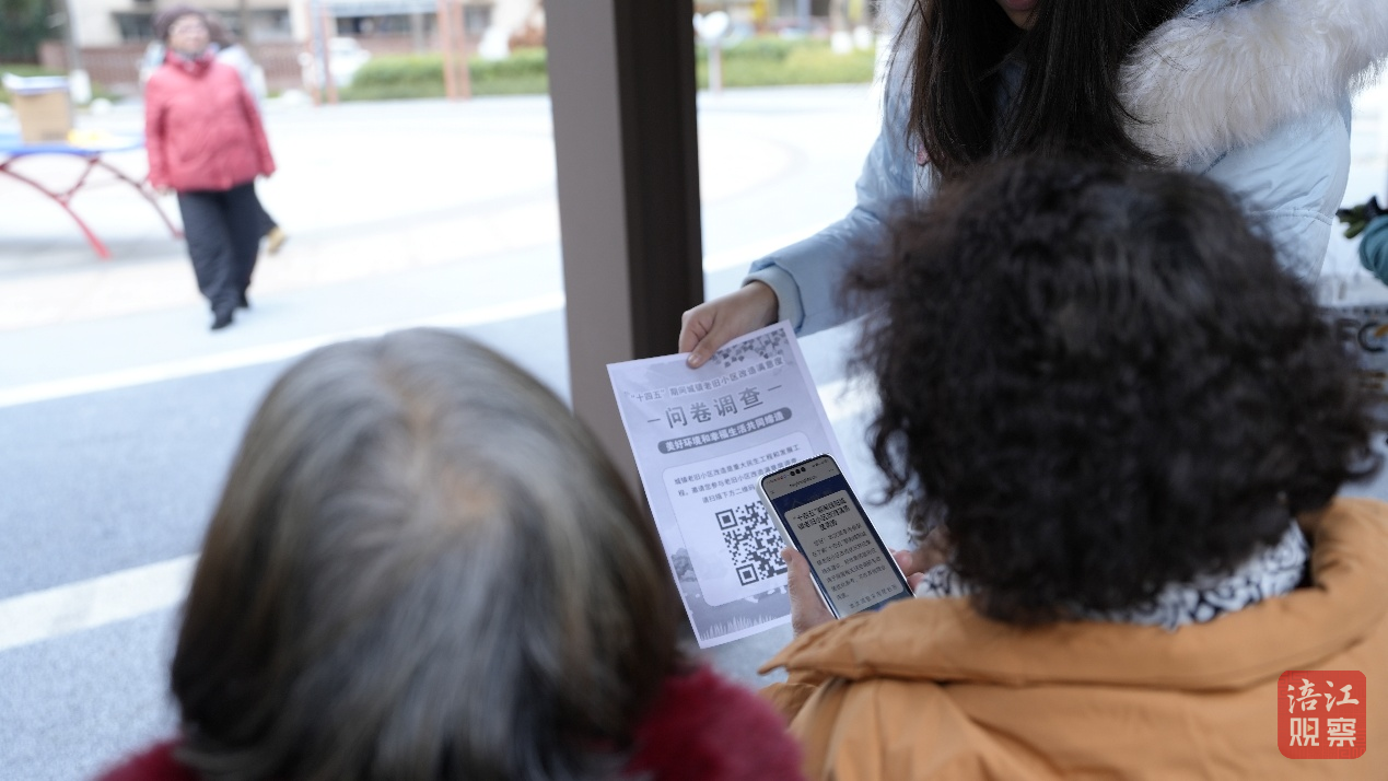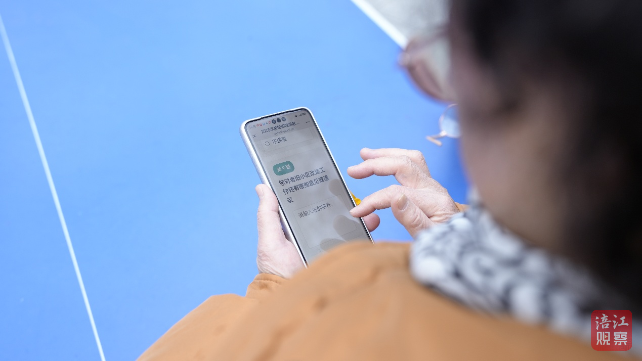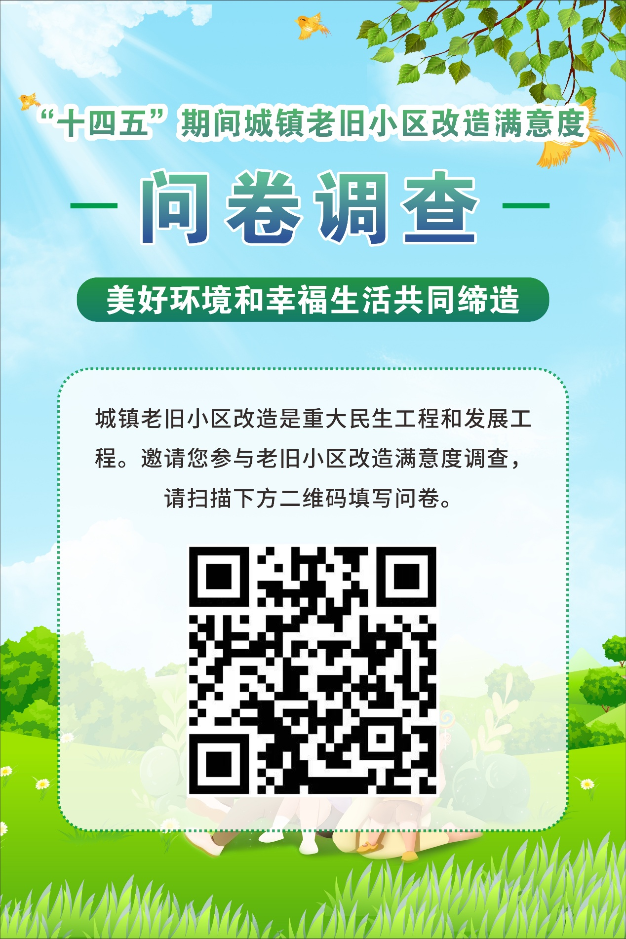 現場,調查海報上寫著:“城鎮(zhèn)老舊小區(qū)改造是重大民生工程和發(fā)展工程,邀請您參與滿意度調查,請掃下方二維碼填寫問卷。”居民們正在工作人員的協(xié)助下掃碼填寫。