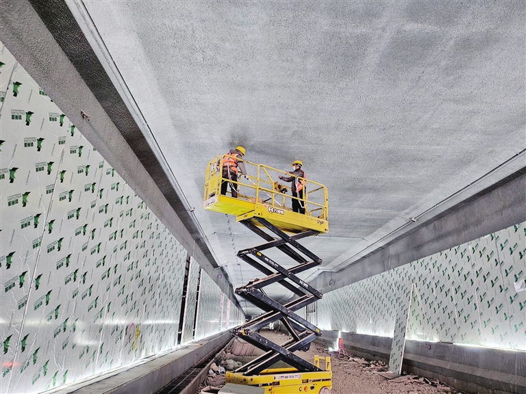 該項(xiàng)目包括臨園路下穿隧道工程和站前廣場(chǎng)改造工程兩部分。其中,臨園路下穿隧道工程已于1月5日完成主體結(jié)構(gòu),計(jì)劃春節(jié)前實(shí)現(xiàn)通車。“目前隧道施工已進(jìn)入收尾沖刺階段,U型槽側(cè)墻石材已經(jīng)裝完,截水溝和防撞石施工已于1月22日完工。同時(shí),照明、監(jiān)控將在本月底安裝完畢,側(cè)墻裝飾板材將在1月28日完工,地面找平也在穩(wěn)步推進(jìn),頂板土方回填有序進(jìn)行,預(yù)計(jì)春節(jié)前達(dá)到通車條件。”海丹介紹,下穿隧道在設(shè)計(jì)時(shí),還預(yù)留了一條南北走向的人行下穿隧道。待站前廣場(chǎng)改造工程完工,該隧道將直接連通站前廣場(chǎng)負(fù)一樓。屆時(shí),出站旅客可通過人行下穿隧道橫穿臨園干道。