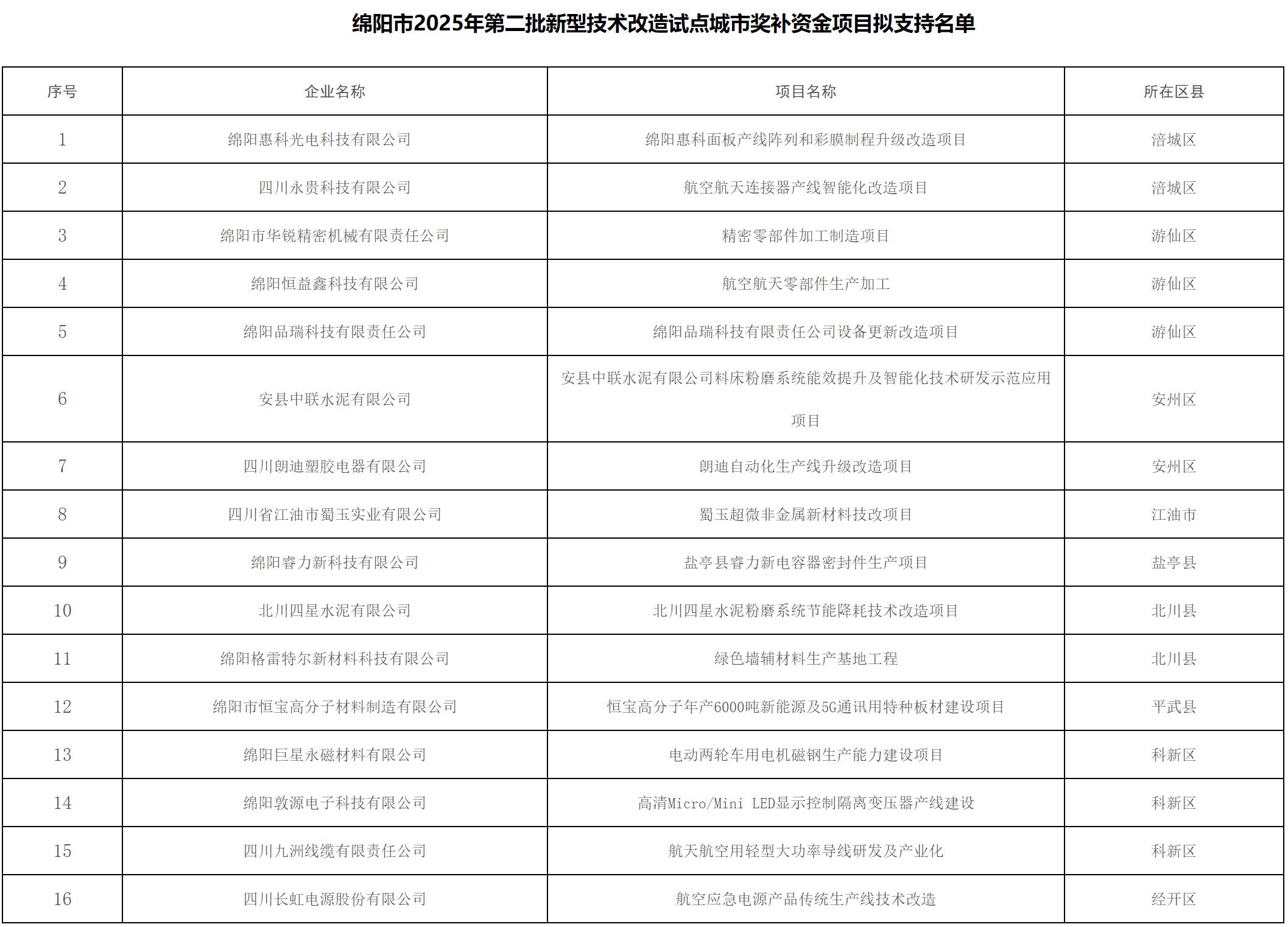 根據(jù)財(cái)政廳、經(jīng)濟(jì)和信息化廳工作安排,按照綿陽市經(jīng)濟(jì)和信息化局《關(guān)于做好綿陽市2025年第二批新型技術(shù)改造試點(diǎn)城市獎(jiǎng)補(bǔ)資金項(xiàng)目申報(bào)的通知》(綿經(jīng)信技改〔2025〕179號(hào))、《關(guān)于補(bǔ)充征集綿陽市2025年第二批新型技術(shù)改造試點(diǎn)城市獎(jiǎng)補(bǔ)資金項(xiàng)目申報(bào)的通知》(綿經(jīng)信技改〔2025〕195號(hào))要求,通過企業(yè)自主申報(bào),縣(市、區(qū))、園區(qū)工業(yè)經(jīng)濟(jì)主管部門初審?fù)扑],經(jīng)相關(guān)科室審核、專家評(píng)審、現(xiàn)場(chǎng)核實(shí)、征求相關(guān)行業(yè)主管部門意見和市經(jīng)信局黨組會(huì)審議等程序,現(xiàn)對(duì)擬支持的16個(gè)項(xiàng)目名單予以公示。