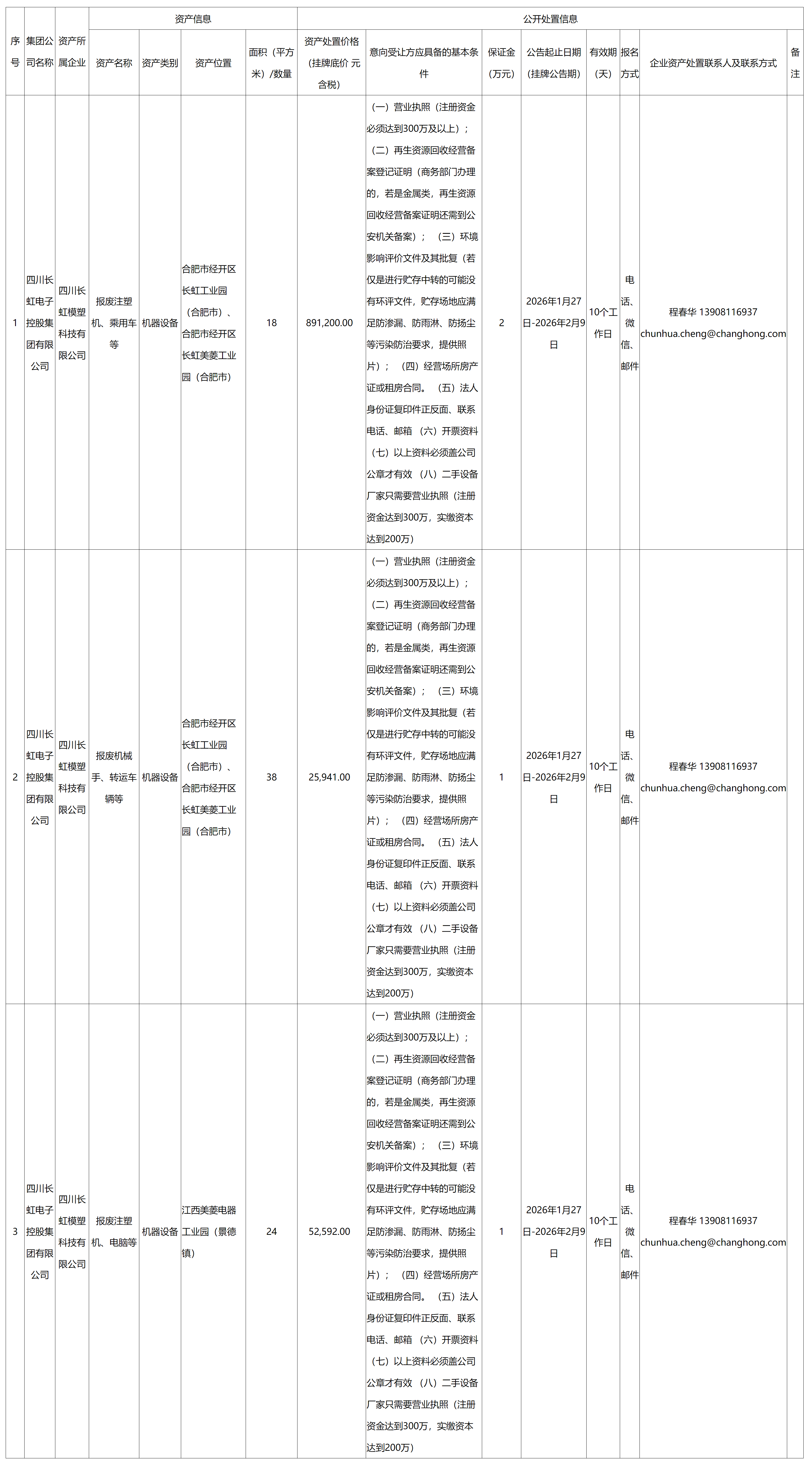 四川長虹模塑科技有限公司企業(yè)資產(chǎn)處置公告