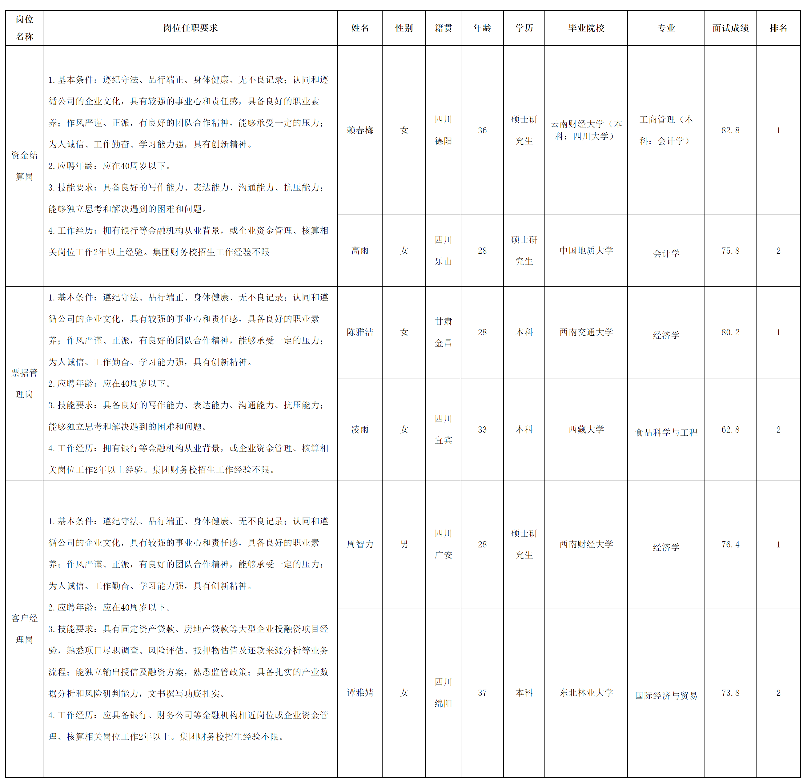 根據(jù)四川長虹集團(tuán)財務(wù)有限公司發(fā)布的招聘公告及招聘相關(guān)規(guī)定,經(jīng)面試評估后,現(xiàn)將面試成績予以公示。