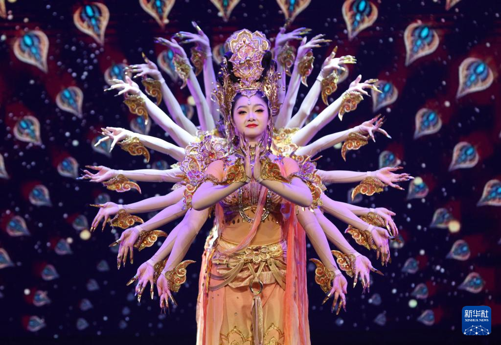 1月28日,在阿爾及利亞首都阿爾及爾舉行的文藝演出上,甘肅省歌舞劇院演員表演《千手觀音》。