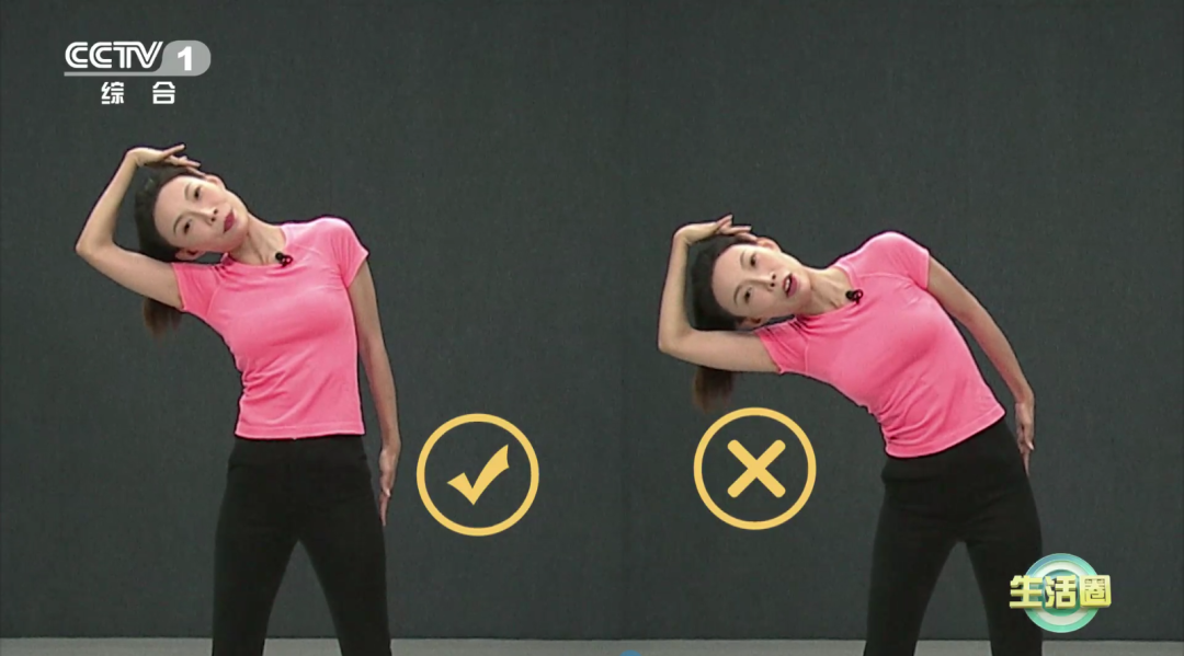 1.雙手叉腰,低頭,然后仰頭,最大限度去拉伸頸部;