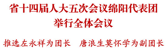 綿陽(yáng)新聞網(wǎng)專(zhuān)電 2月2日,省十四屆人大五次會(huì)議綿陽(yáng)代表團(tuán)在駐地舉行全體會(huì)議,推選省委常委、市委書(shū)記左永祥為綿陽(yáng)代表團(tuán)團(tuán)長(zhǎng),市人大常委會(huì)主任唐浪生和市委副書(shū)記、政法委書(shū)記莫懷學(xué)為副團(tuán)長(zhǎng)。