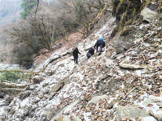 循著水聲走向泗耳溝深處,隊伍攀爬近乎垂直的陡坡,踏過覆冰的河灘,被一道30米寬的急流攔住了去路。