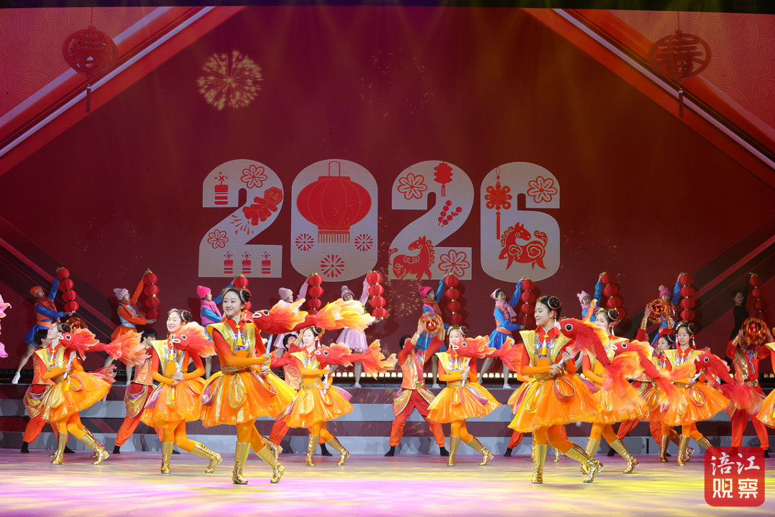 當天14時30分,隨著“新年鐘聲”響起,舞臺上近400個大紅燈籠組成的燈籠墻緩緩升起,一陣清脆的馬蹄聲中,演員們手持對聯(lián)、繡球、魚燈逶迤而出。124人演繹的開場歌舞《金馬踏春賀新年》,以豐富的舞臺表達和飽滿的視覺語言烘托出喜慶、祥和的節(jié)日氛圍。