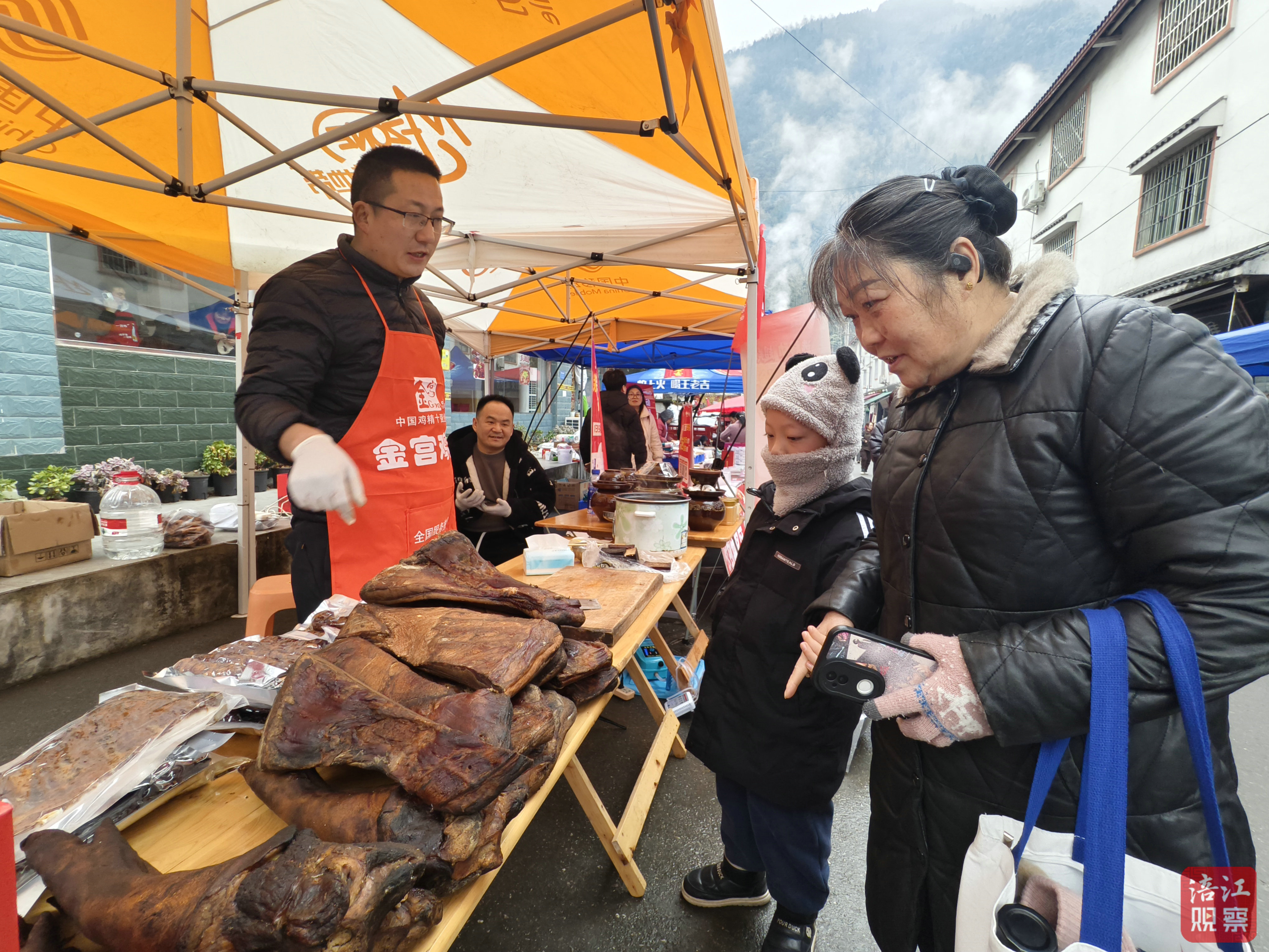 上午九點(diǎn)的集市,“財(cái)神駕到”點(diǎn)位前已排起小隊(duì)。扮演財(cái)神的政府工作人員小趙在傘下把糖果分給孩子們。歐陽慧城接過糖果,小心地在地圖上蓋下第一個(gè)印章——金元寶圖案端正地落在方框里。奶奶的目光則越過人群,落在那些掛著臘肉、擺著山貨的攤位上,賣野菜的老陳熟絡(luò)地招呼:“老鄉(xiāng),今天折耳根嫩得很,給你留了一把!”年味在糖果的香甜與熟人問候的暖意中交織彌漫。