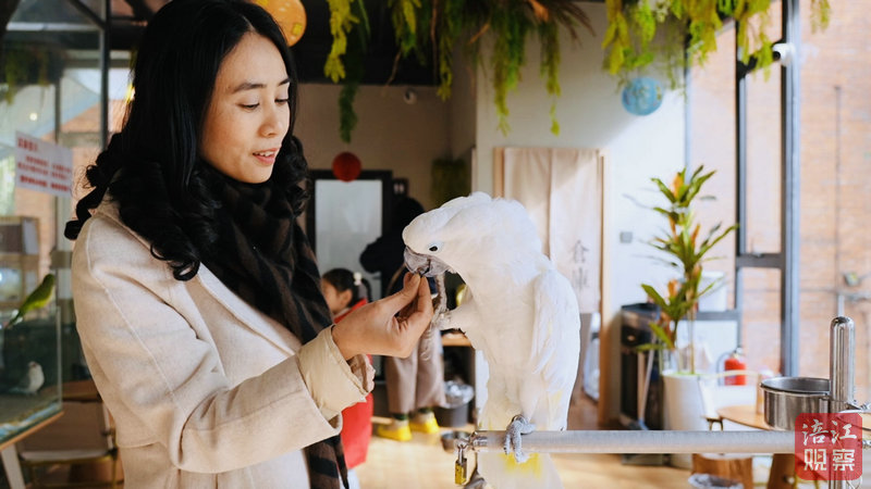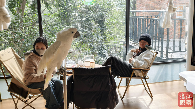 “貓咖狗咖都火出圈了,為啥不可以有鳥咖的一席之地呢?”走進園區(qū)內(nèi)的有聲鳥咖,店主黃娟一邊照料鸚鵡,一邊介紹她的創(chuàng)業(yè)初衷。店內(nèi),一棵大樹貫穿兩層小樓,七八種鸚鵡在二樓空間活動,不時落在客人肩頭“搭話”。