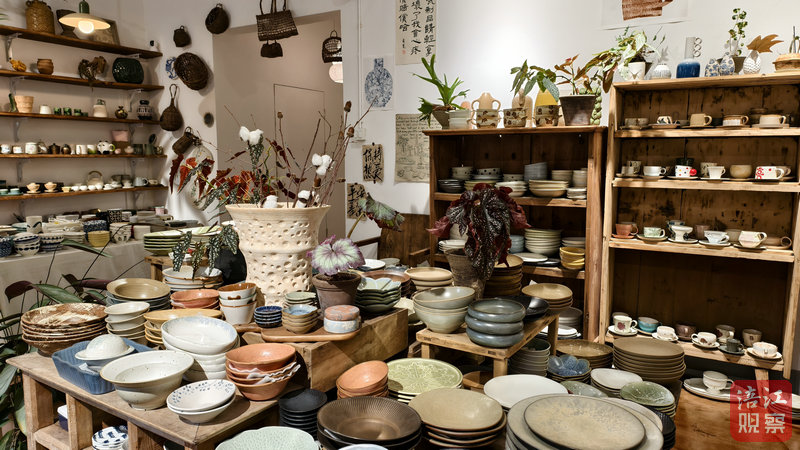 不遠處的“有瓷”陶瓷店里,原木貨架上整齊陳列著茶杯、手繪花卉碟、馬年生肖主題擺件等,各式精致陶藝品錯落有致。