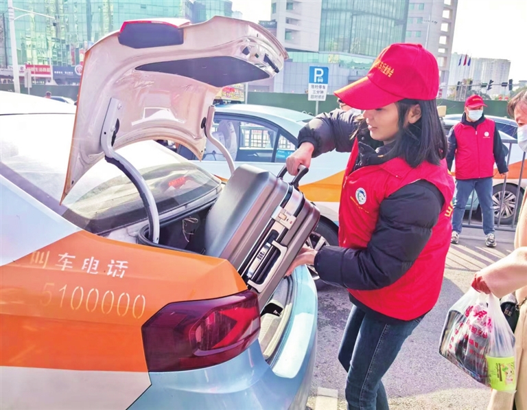 2月10日上午,隨著一趟趟列車安全抵達(dá),綿陽火車站站前廣場的出租車乘坐點(diǎn)排起了長隊(duì)。“您好,請(qǐng)走這邊上車,行李交給我來幫您放在后備箱。”綿陽空港出租車有限公司志愿者鄧春燕快步走到一位乘客身邊,開車門、放行李、示意車輛出發(fā),整個(gè)動(dòng)作一氣呵成。遠(yuǎn)遠(yuǎn)望去,偌大的候車區(qū)還有很多身穿紅馬甲的志愿者穿梭在車流中,他們有的負(fù)責(zé)指揮出租車有序進(jìn)場,有的忙著搬運(yùn)大包小包的行李,有的幫助行動(dòng)不便的旅客上車。“每次看到乘客順利上車、踏上回家的路,我就覺得特別溫暖。”鄧春燕笑著分享道。