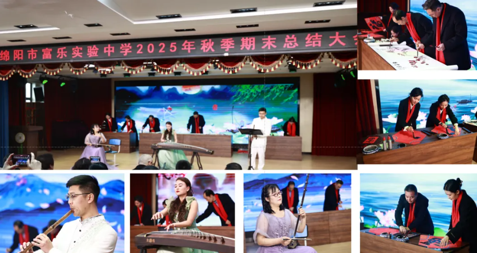 文藝匯演環(huán)節(jié),開場(chǎng)節(jié)目《器樂合奏》由音樂、美術(shù)組呈現(xiàn),活力四射,用靈動(dòng)的韻律與書法展示,展現(xiàn)了富樂人的青春活力與追夢(mèng)激情。