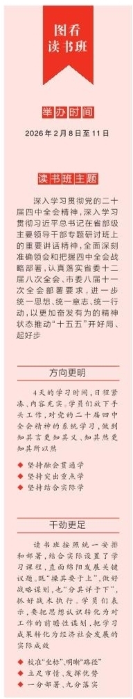 2026年是“十五五”開局之年。2月8日至11日,市委黨校學(xué)習(xí)熱潮涌動,市委舉辦的縣處級主要負(fù)責(zé)同志學(xué)習(xí)貫徹黨的二十屆四中全會精神讀書班在這里舉行。