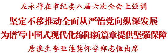 綿陽新聞網(wǎng)訊 2月12日,中國共產(chǎn)黨綿陽市第八屆紀律檢查委員會第六次全體會議舉行,省委常委、市委書記左永祥出席會議并講話。他強調(diào),要深入學(xué)習貫徹習近平總書記關(guān)于黨的建設(shè)的重要思想、關(guān)于黨的自我革命的重要思想,全面落實二十屆中央紀委五次全會精神和省紀委十二屆五次全會部署要求,堅定扛牢管黨治黨政治責任,堅定不移推動全面從嚴治黨向縱深發(fā)展,為譜寫中國式現(xiàn)代化綿陽新篇章提供堅強保障。