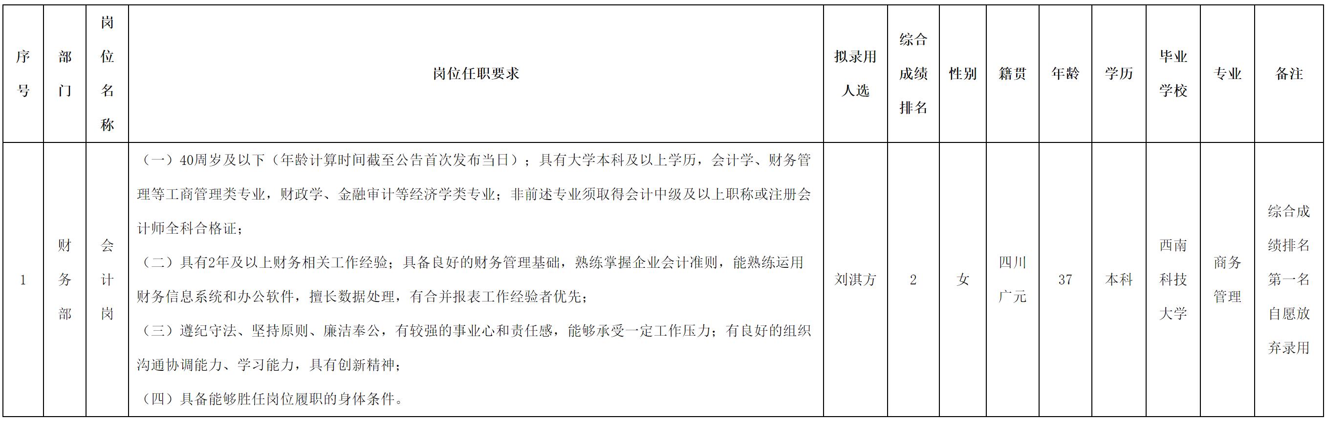 根據(jù)綿陽金控投資管理有限責(zé)任公司發(fā)布的招聘公告及招聘相關(guān)規(guī)定,經(jīng)筆試、面試、背調(diào)、體檢等程序,擬錄用劉淇方到綿陽金控投資管理有限責(zé)任公司工作,現(xiàn)予以公示,具體情況如下: