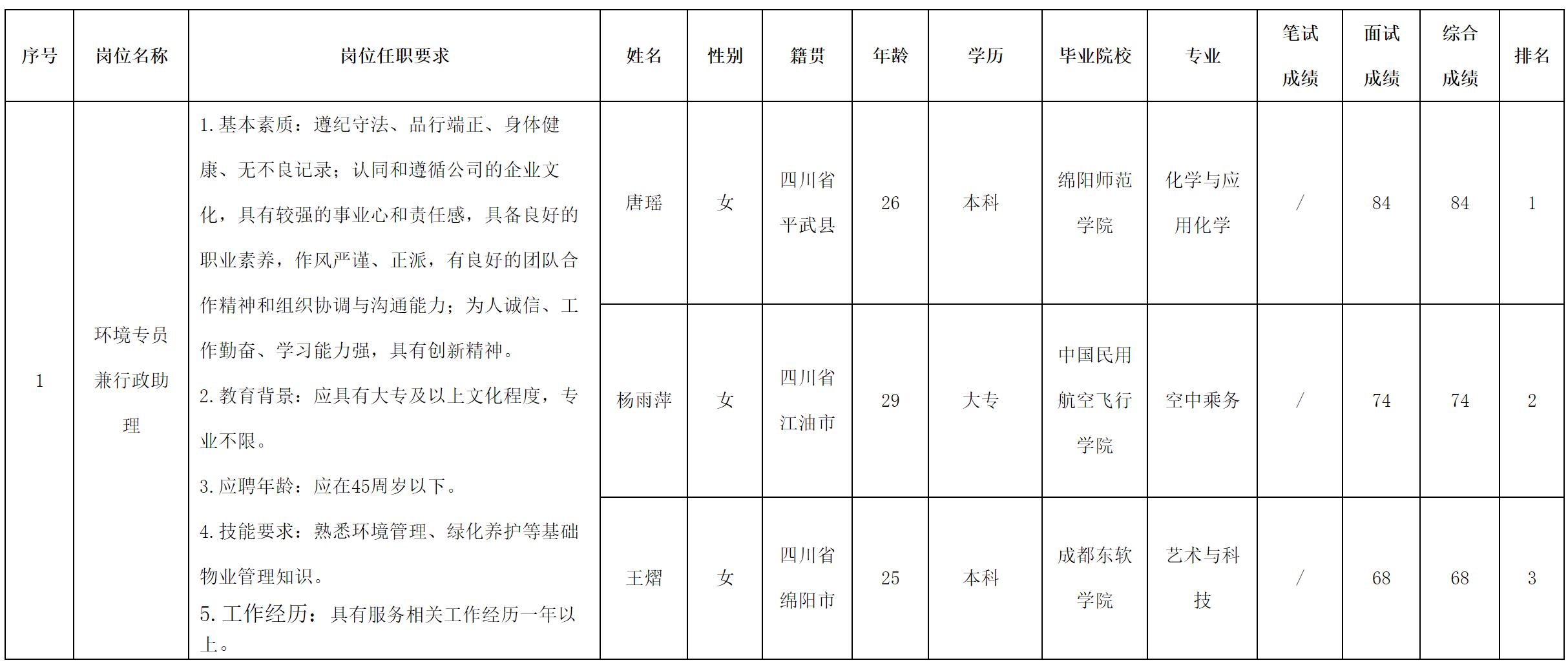 根據(jù)四川長虹物業(yè)服務(wù)有限責(zé)任公司綿陽分公司發(fā)布的招聘公告及招聘相關(guān)規(guī)定,現(xiàn)將測試成績予以公示。