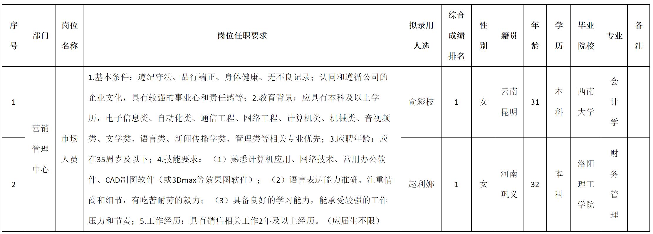 根據(jù)四川湖山電器股份有限公司發(fā)布的招聘公告及招聘相關(guān)規(guī)定,經(jīng)測(cè)試、考察、體檢等程序,擬錄用俞彩枝等2名同志到四川湖山電器股份有限公司工作,現(xiàn)予以公示,具體情況如下: