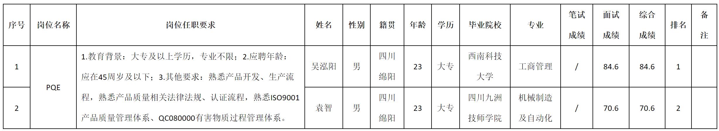 根據(jù)四川九州電子科技股份有限公司發(fā)布的招聘公告及招聘相關規(guī)定,現(xiàn)將測試成績予以公示。