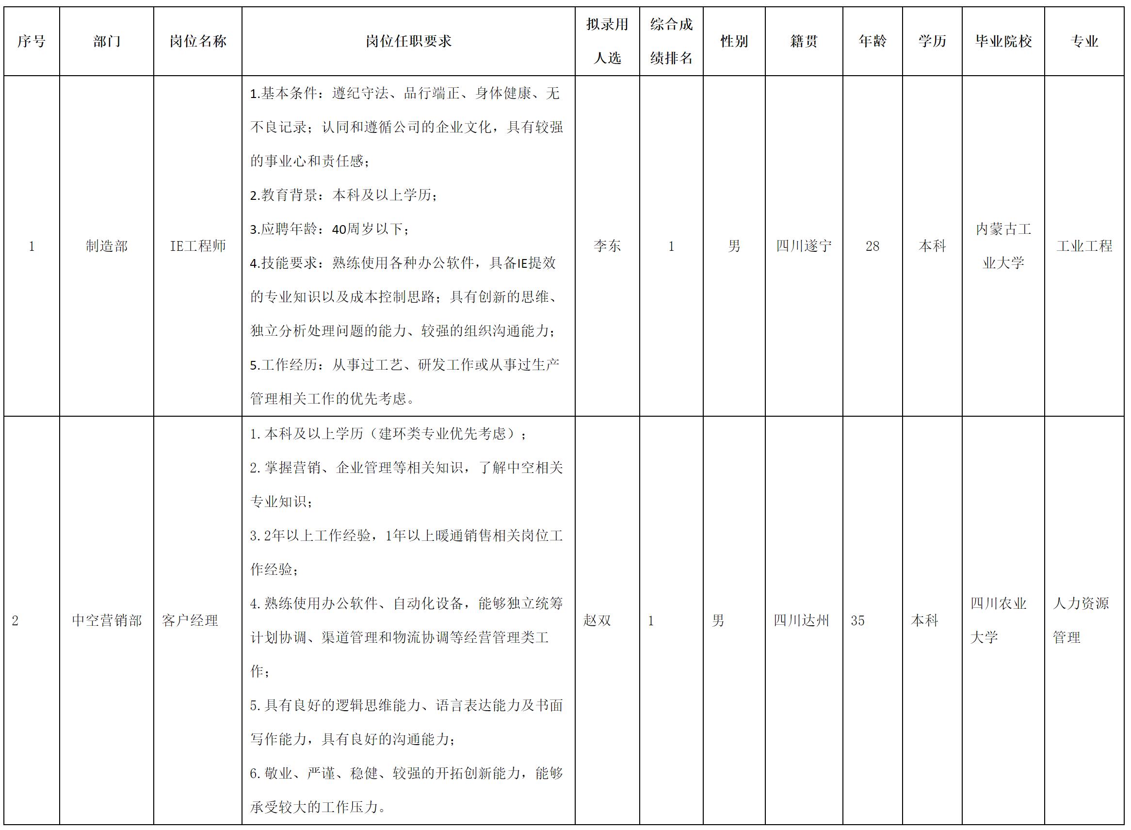根據(jù)四川長虹空調(diào)有限公司發(fā)布的招聘公告及招聘相關(guān)規(guī)定,經(jīng)面試、測試、考察、體檢,擬錄用李東等同志到長虹空調(diào)工作,現(xiàn)予以公示,具體情況如下: