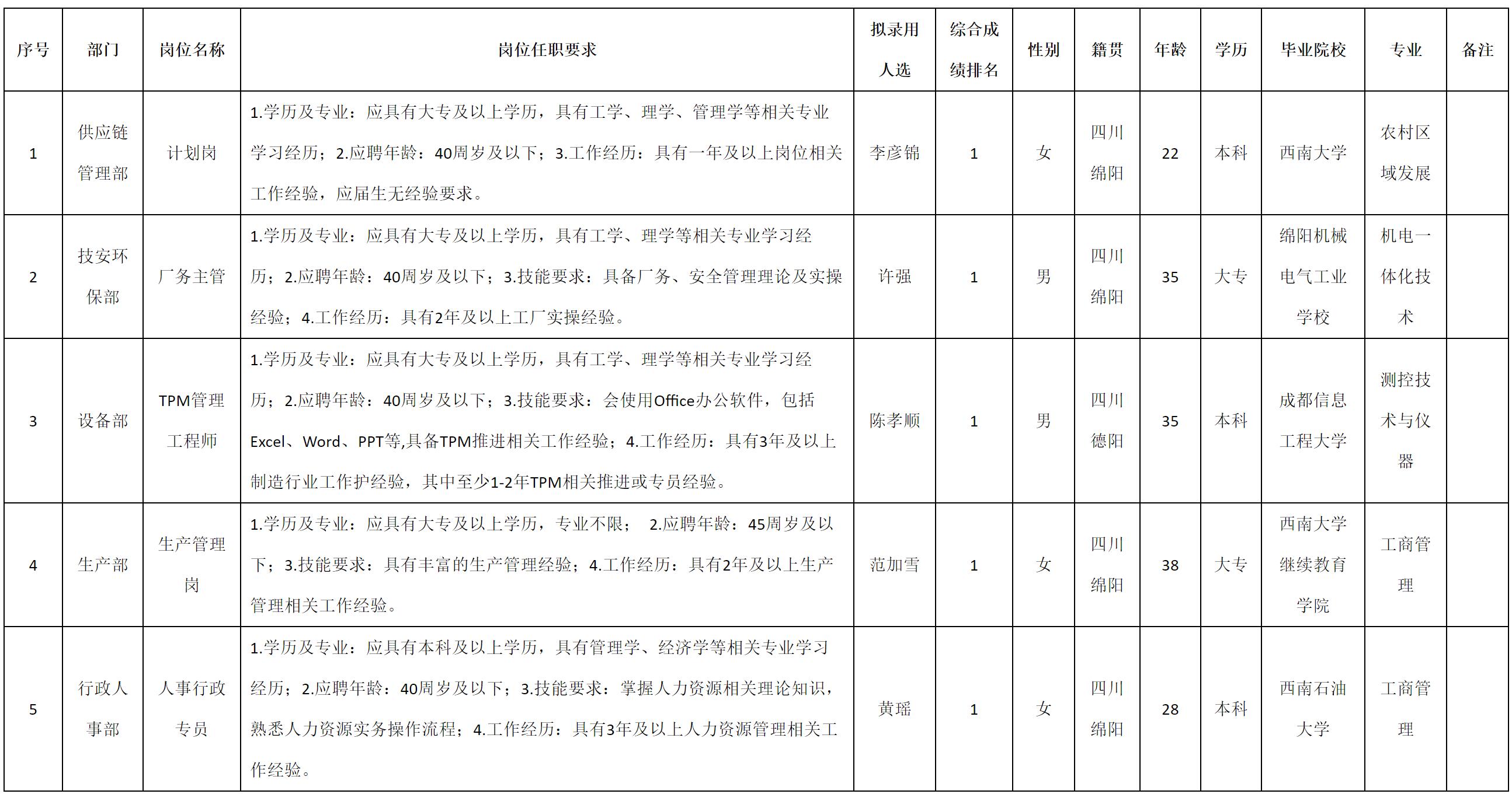 根據四川九華光子通信技術有限公司發(fā)布的招聘公告及招聘相關規(guī)定,經測試、考察、體檢等程序,擬錄用李彥錦等5名同志到四川九華光子通信技術有限公司工作,現予以公示,具體情況如下: