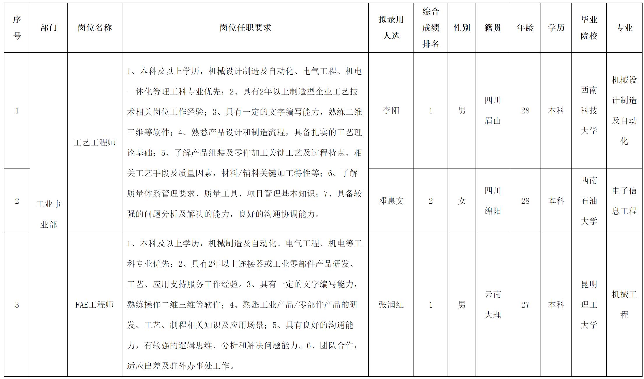 根據(jù)四川華豐科技股份有限公司發(fā)布的招聘公告及招聘相關(guān)規(guī)定,經(jīng)測試等程序,擬錄用李陽等同志到四川華豐科技股份有限公司工作,現(xiàn)予以公示,具體情況如下: