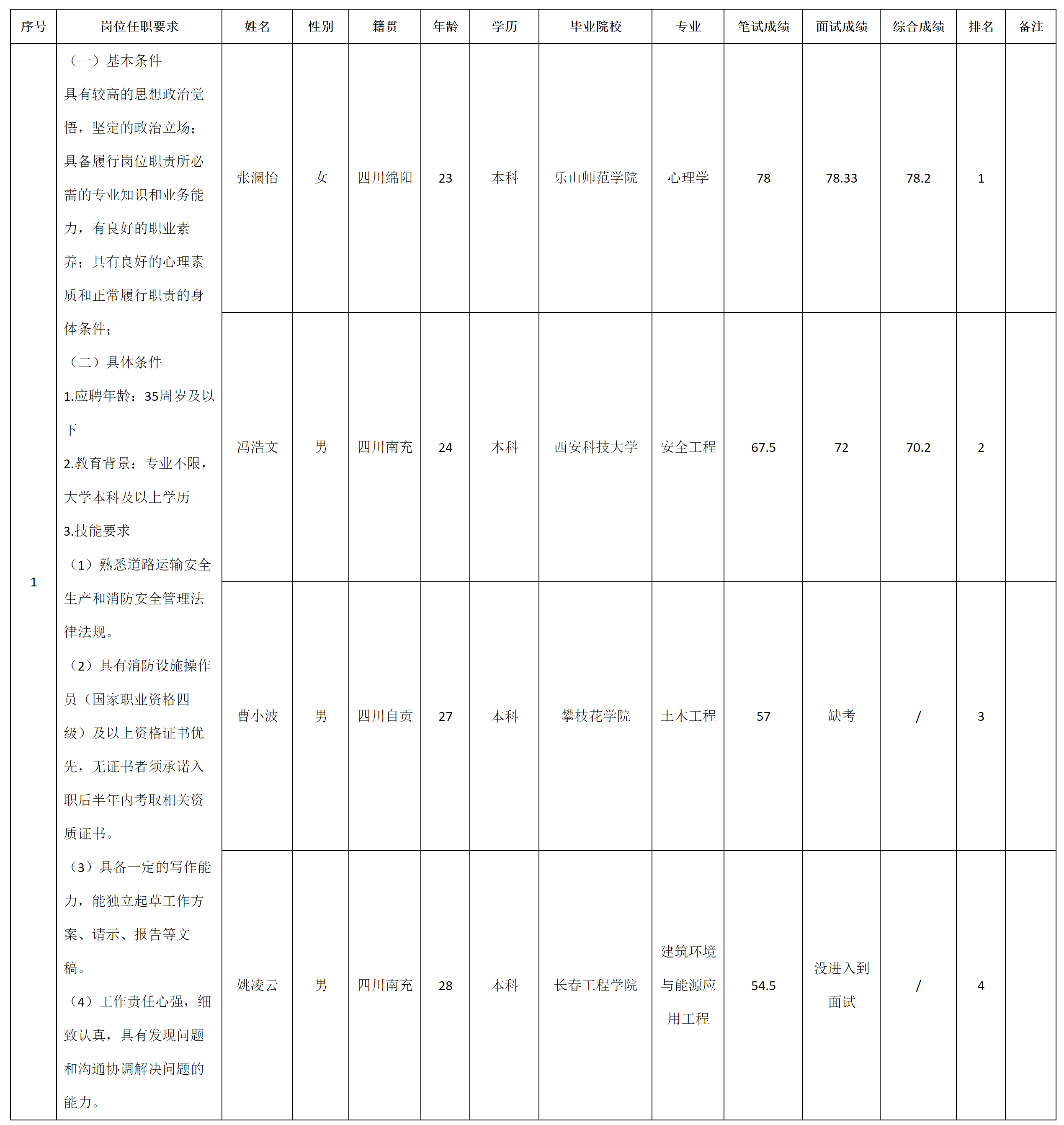 根據(jù)綿陽市龍宇出租汽車有限公司發(fā)布的招聘公告及招聘相關(guān)規(guī)定,經(jīng)筆試、面試等程序,現(xiàn)將筆試(面試)成績予以公示。
