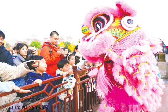 在綿陽方特東方神畫,舞獅表演吸引游客圍觀。記者 李春梅 攝