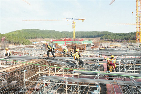綿陽新型顯示產業(yè)園基礎設施建設項目現(xiàn)場,工人正進行廠房主體結構施工。記者 尹秦 攝