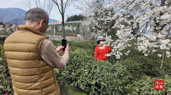 一旁的游客龔婷婷也難掩欣喜:“早就聽說(shuō)北川蓋頭山的櫻花好看,今天特意帶家人過(guò)來(lái),一到這里就被驚艷了,粉粉白白的,拍照特別出片,感覺整個(gè)人都融入了春天。這里不僅能賞花還能采茶,這次出行特別有意義,回去要推薦給朋友。”