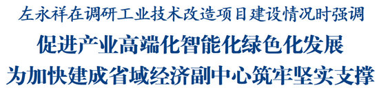 綿陽新聞網(wǎng)訊 3月3日,省委常委、市委書記左永祥前往城區(qū)部分企業(yè),調(diào)研工業(yè)技術改造項目建設情況。他強調(diào),要深入學習貫徹習近平總書記關于新型工業(yè)化的重要論述和對四川對綿陽工作系列重要指示精神,全面落實黨中央和省委部署要求,堅持以科技創(chuàng)新為引領、以實體經(jīng)濟為根基,深入推進新型工業(yè)化,持續(xù)扎實細致抓好技術改造,促進產(chǎn)業(yè)高端化、智能化、綠色化發(fā)展,為加快建成省域經(jīng)濟副中心筑牢堅實支撐。