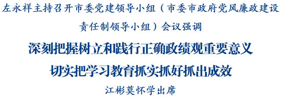 綿陽新聞網(wǎng)訊 3月5日,市委黨建領(lǐng)導(dǎo)小組(市委市政府黨風(fēng)廉政建設(shè)責(zé)任制領(lǐng)導(dǎo)小組)會(huì)議召開,省委常委、市委書記、領(lǐng)導(dǎo)小組組長(zhǎng)左永祥主持會(huì)議并講話。他強(qiáng)調(diào),要深入學(xué)習(xí)貫徹習(xí)近平總書記關(guān)于樹立和踐行正確政績(jī)觀學(xué)習(xí)教育的重要講話和重要指示精神,認(rèn)真落實(shí)黨中央、省委部署要求,深刻把握樹立和踐行正確政績(jī)觀重要意義,增強(qiáng)開展好學(xué)習(xí)教育的政治自覺、思想自覺和行動(dòng)自覺,切實(shí)把學(xué)習(xí)教育抓實(shí)抓好抓出成效。