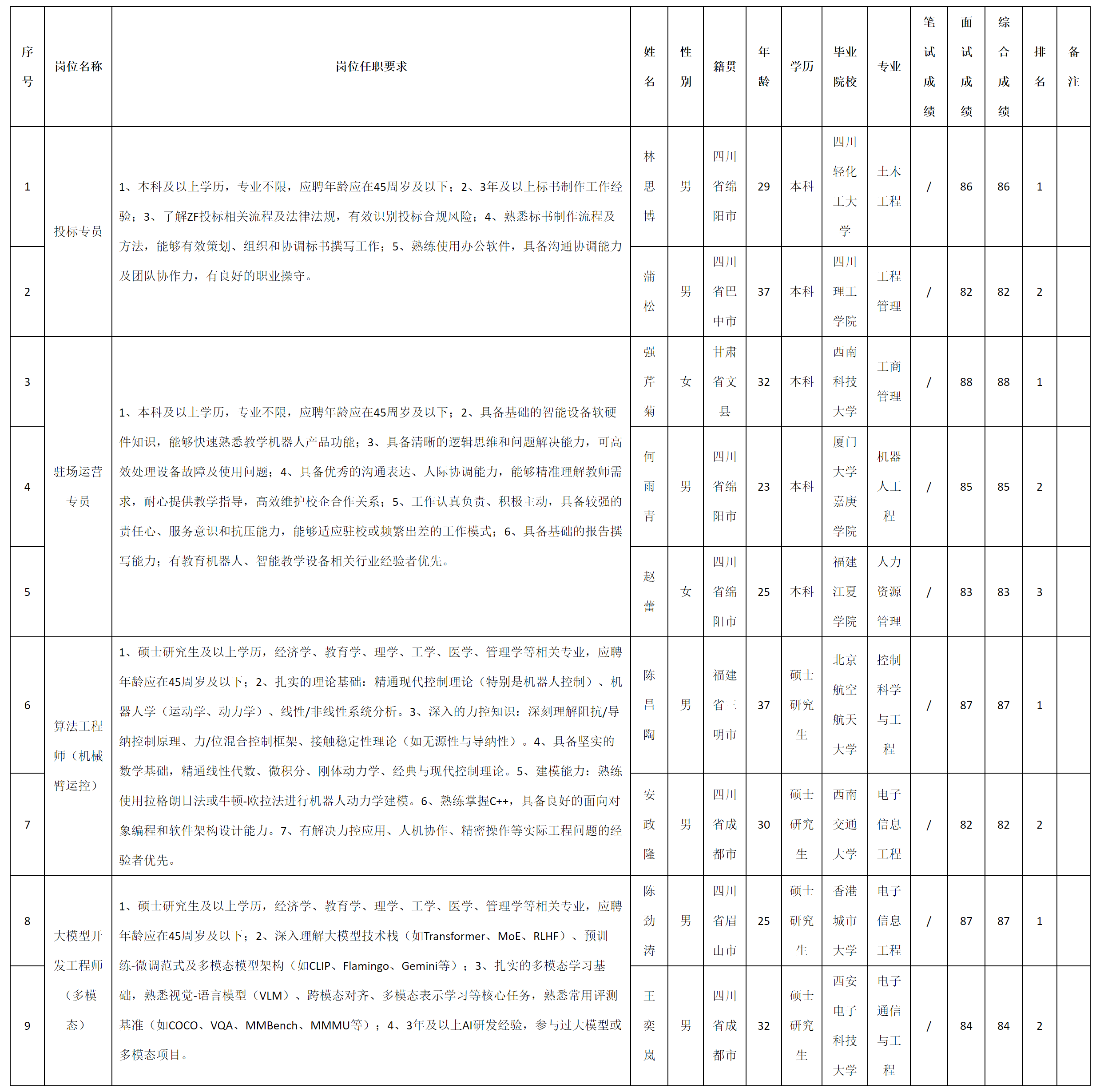 根據(jù)四川九洲投資控股集團(tuán)有限公司軟件與數(shù)據(jù)智能產(chǎn)業(yè)發(fā)布的招聘公告及招聘相關(guān)規(guī)定,現(xiàn)將測(cè)試成績(jī)予以公示。