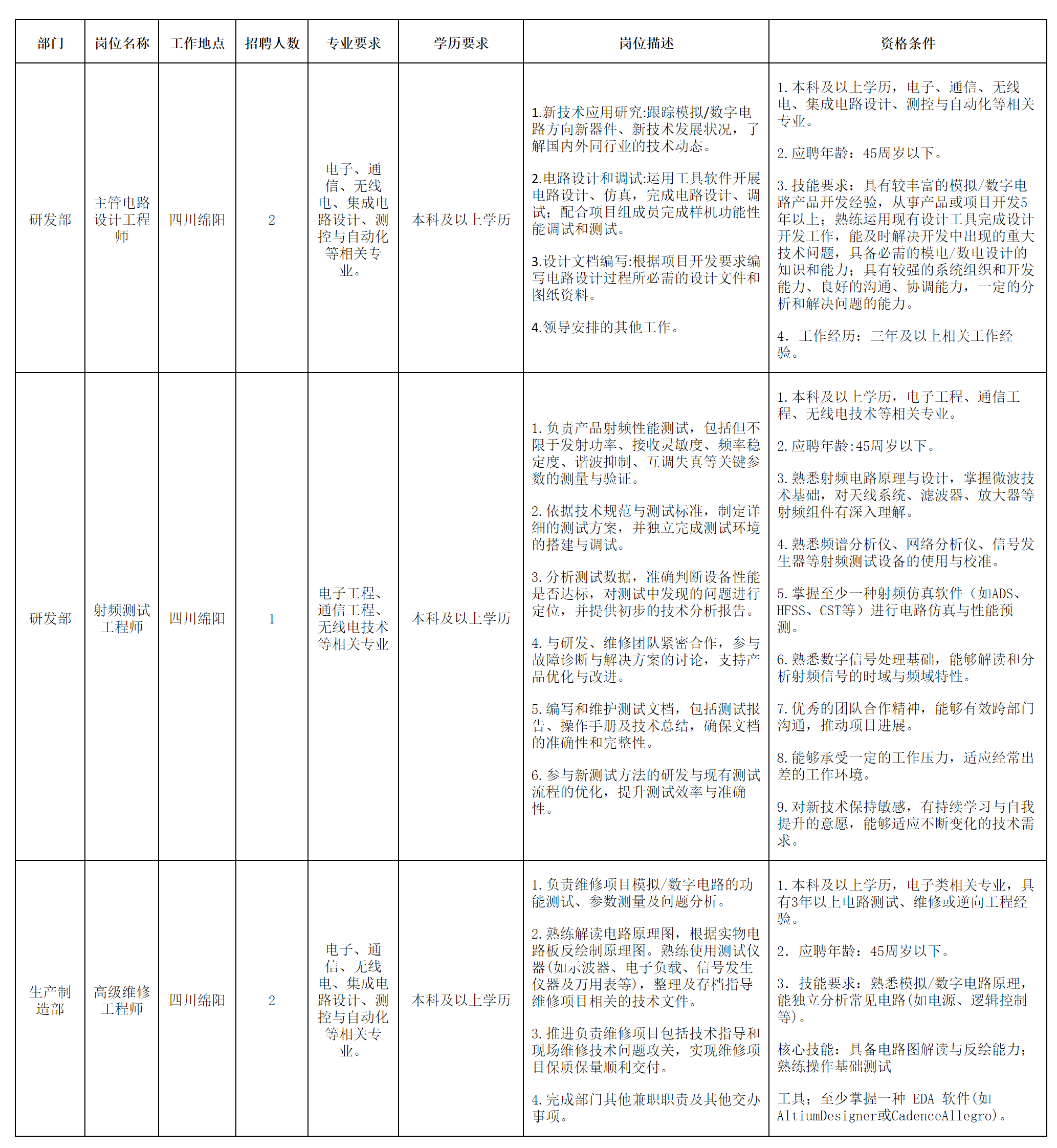 四川長(zhǎng)虹電子科技有限公司(國(guó)營(yíng)第七八〇廠(chǎng))始建于1958年,是國(guó)家“一五”期間的156個(gè)重點(diǎn)項(xiàng)目之一,是我國(guó)第一個(gè)機(jī)載火控雷達(dá)科研生產(chǎn)基地,位于綿陽(yáng)市經(jīng)濟(jì)技術(shù)開(kāi)發(fā)區(qū)。公司注冊(cè)資本1.7億元人民幣,為國(guó)有獨(dú)資企業(yè)。公司以高端光電儀器和高端光電裝備為主線(xiàn),主要從事重力測(cè)量、光電探測(cè)和光電告警領(lǐng)域產(chǎn)品研發(fā)和生產(chǎn)。因業(yè)務(wù)發(fā)展需要,現(xiàn)誠(chéng)聘英才,招聘崗位及要求如下: